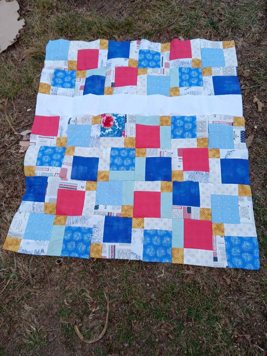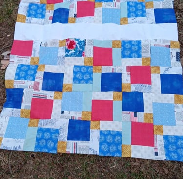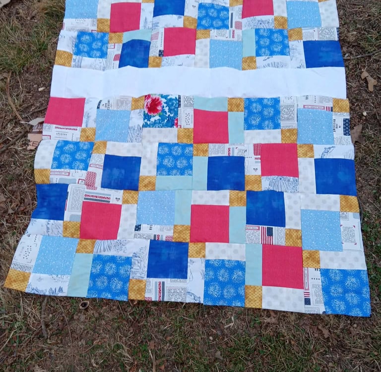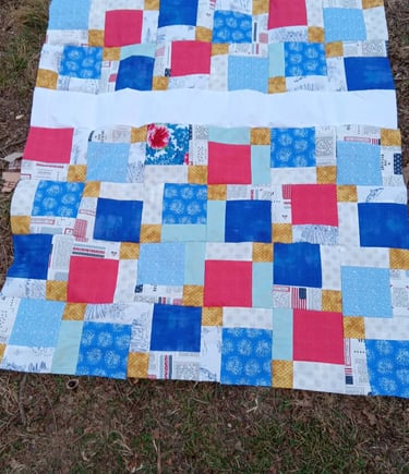 Disappearing 9 Patch was one of the first patterns I ever made, and I recommend it to beginners. It is fairly easy to do, but it looks far more difficult than it is. The basics, are that you make a 9-patch block, or a block with 3 rows of 3 equal size blocks. These could range anywhere from 2” to 30” or even bigger! After you sew the 9-patch together, you cut it in 4 pieces. Halfway down the middle both directions.