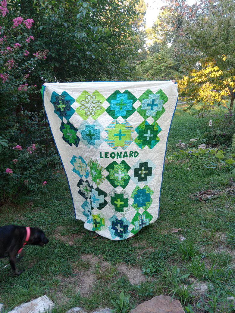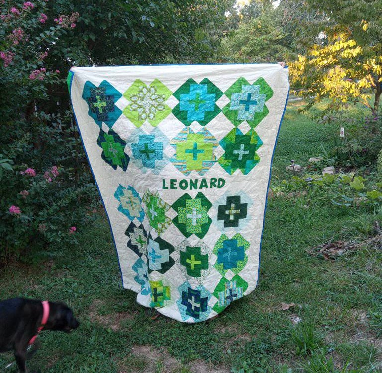 A client recently commissioned me to make twin-size quilts for her grandsons. Her only wishes were she wanted their names on the quilts and that she wanted Walter's to be blue and teal and Leonard's to be green and teal.