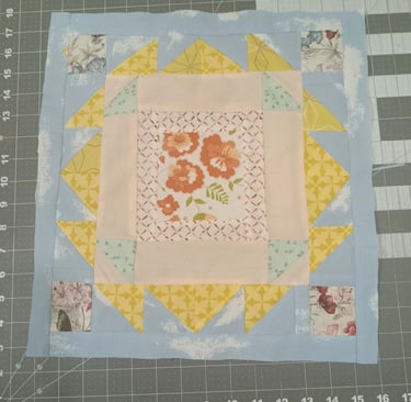 Beth started her block as a simple floral print with a border. Anna aded the Churn-dash looking section, then it was up to me. My first instinct is to add something to bring that bright red out from the center, but Beth was very specific in using pale colors only. Anyone who knows me knows that I love bright bold colors, so this one was more difficult for me.